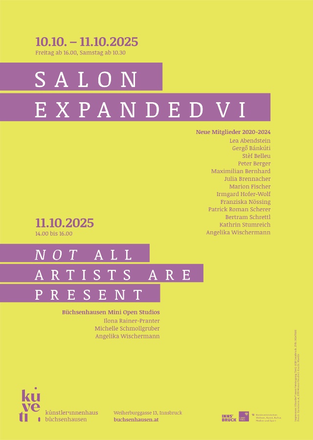 SALON EXPANDED VI brought together a wide range of contemporary artistic practices from and connected to Tyrol. Over two days, newly admitted members of the Künstler*innen Vereinigung Tirol (2020–2024) introduced their work, interests, and approaches within a staged, open setting designed for exchange, discussion, and shared reflection.